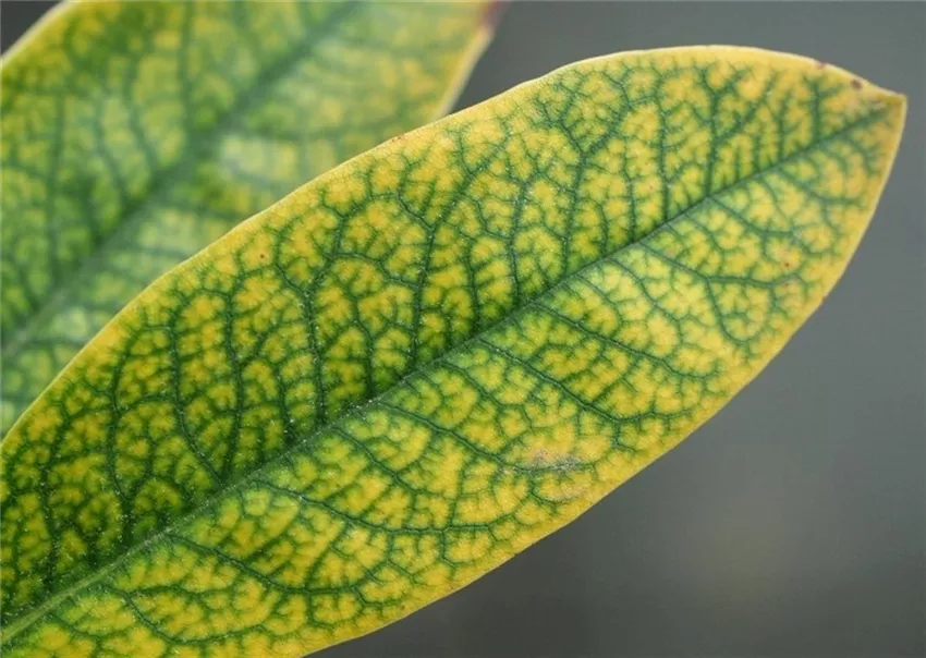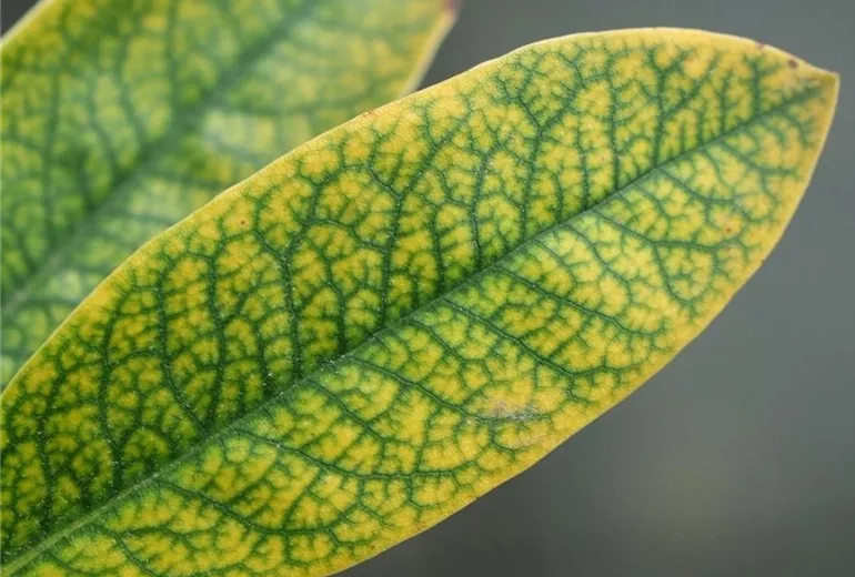 Junge Blätter an den Triebspitzen verlieren die für Rhododendren typische dunkelgrüne Farbe. Sie erscheinen gelb, wobei die Blattadern meist noch grün sind.