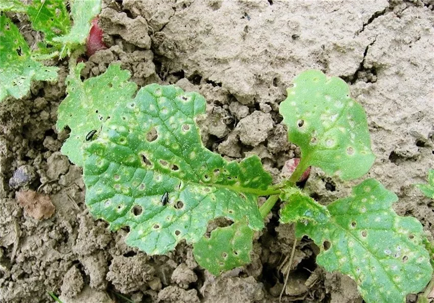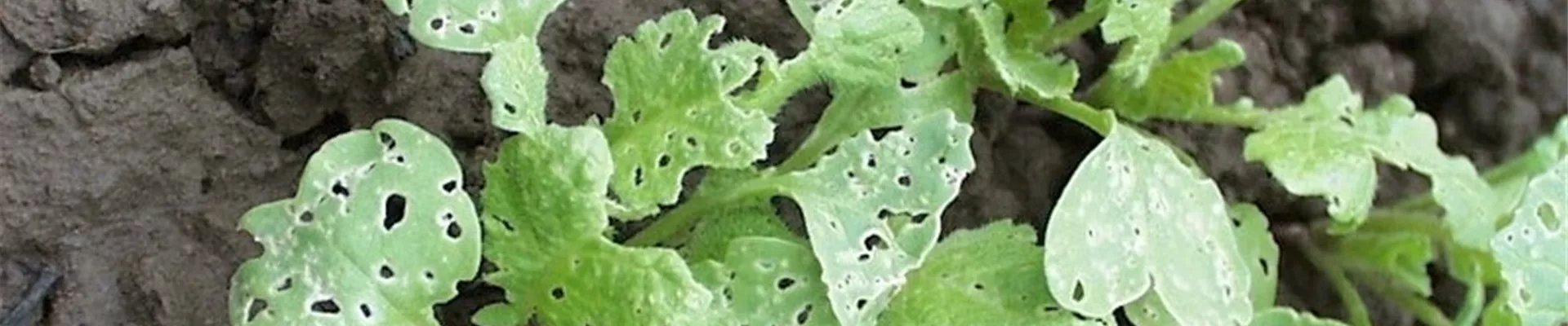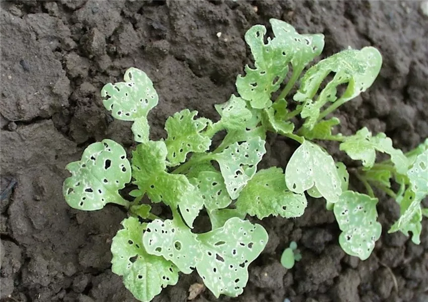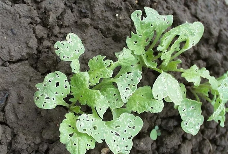 Die ersten jungen Blätter der Rettich oder Radiespflanzen erscheinen siebartig durchlöchert. Vor allem bei warmer Frühjahrswitterung kann es zu erheblichen Schäden kommen, so dass die jungen Pflänzchen sich nicht weiterentwickeln.
