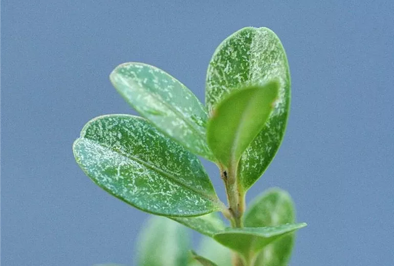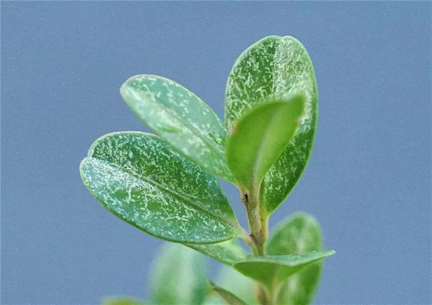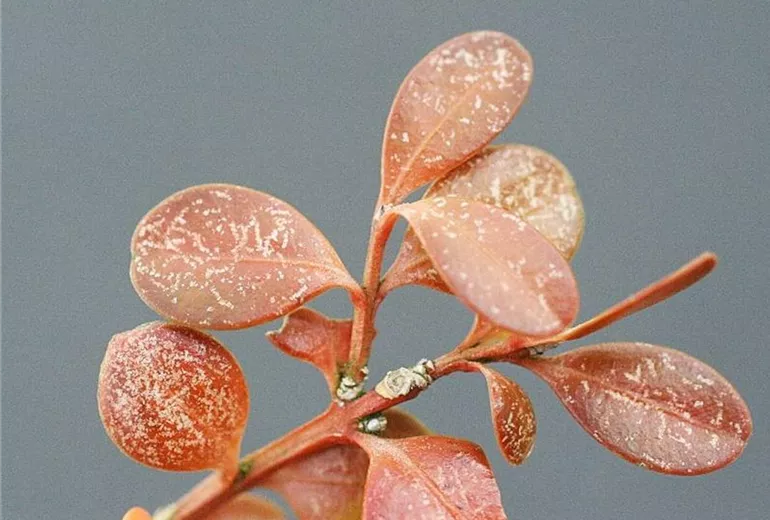 Die immergrünen Blätter des Buschbaums zeigen anfänglich winzige, weiße Flecken. Bei stärkerem Befall verfärben sich die Blätter rötlich. Es ist nicht immer leicht die Tiere auf den Blättern zu finden.