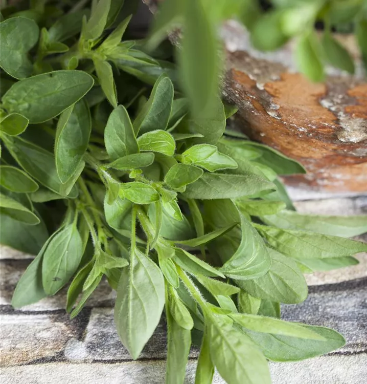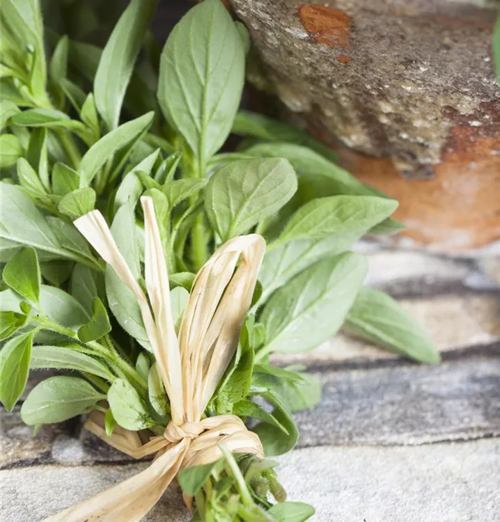 Zum Verzehr geeignet. Die hellgrünen, ganzrandigen Blätter sind eiförmig und überzeugen mit würzigem Geschmack.
