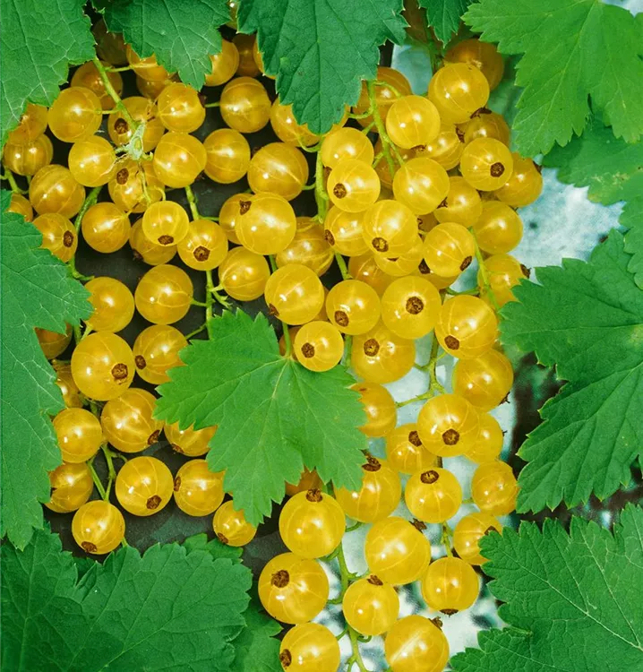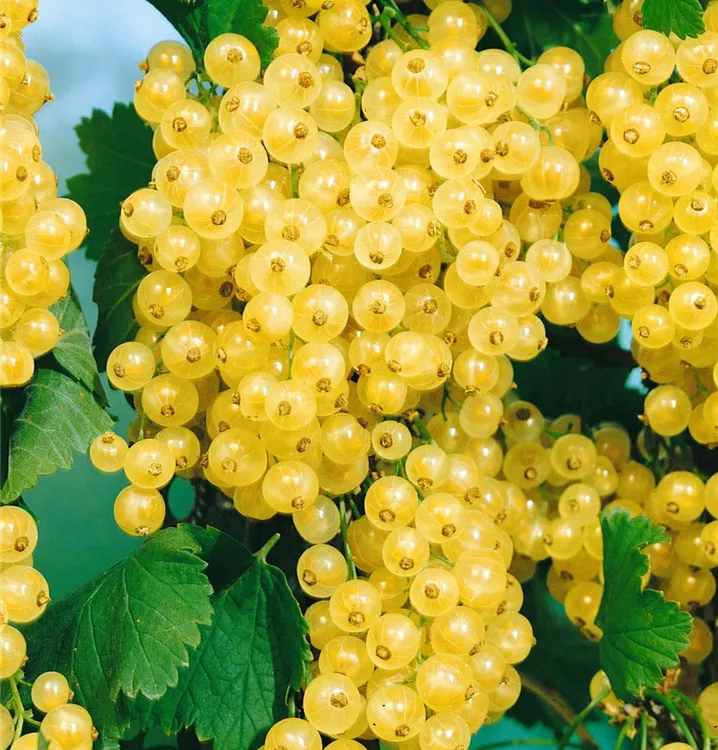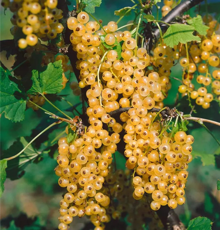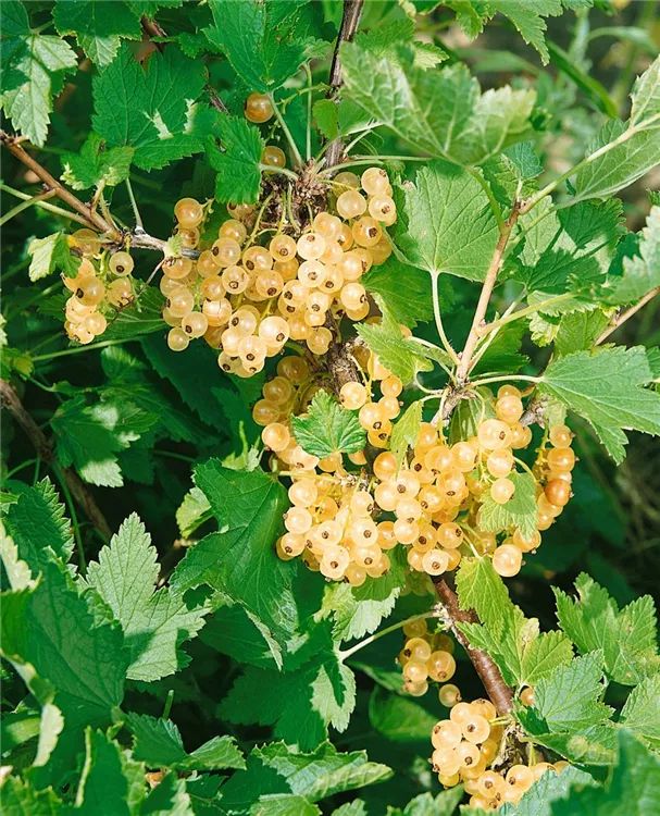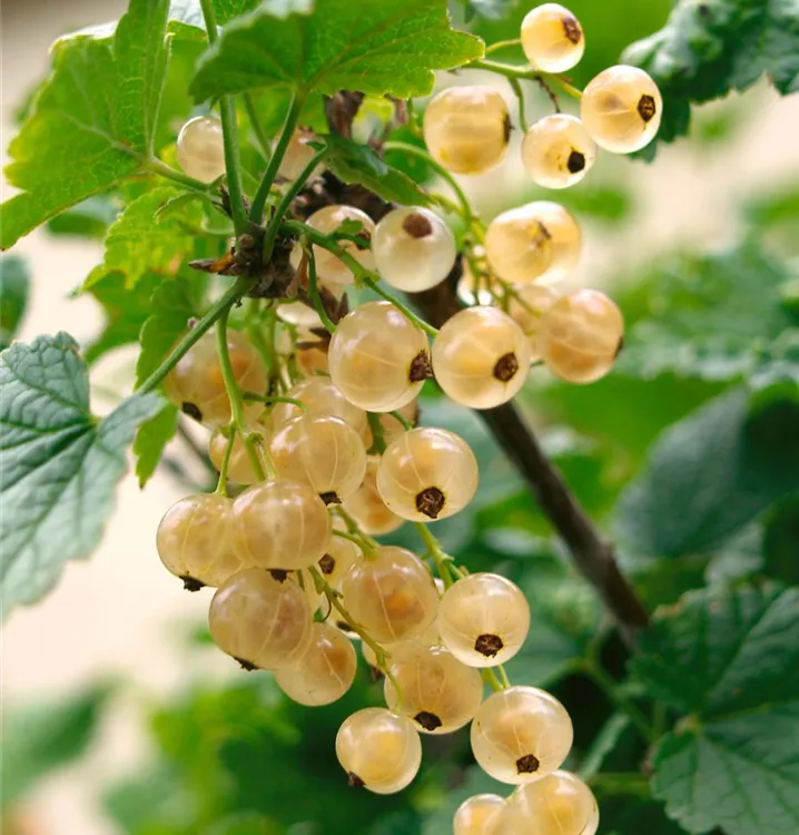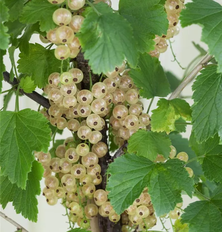 Die Johannisbeere, weißfrüchtig (Ribes rubrum) bildet weiße Beeren. Diese sind süß-säuerlich im Geschmack. Für eine ertragreiche Ernte ab Juni schaffen durchlässiger, nährstoffreicher Boden und ein sonniger bis halbschattiger Standort optimale Bedingungen. Auch ihre grünen Blüten sind eine schöne Erscheinung.
