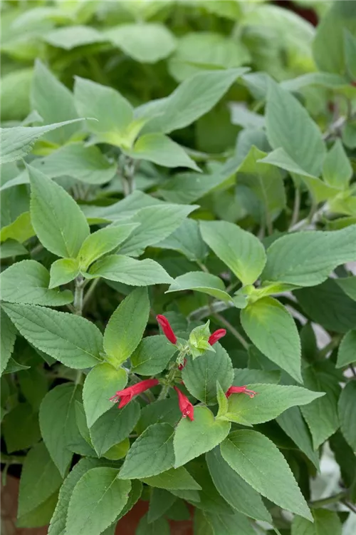 Der Ananas-Salbei 'Scarlet Pineapple' (Salvia elegans) ist eine stark duftende Kräuterpflanze mit einem aromatischen Geschmack. Seine mittelgrünen Blätter sind lanzettlich. Für das optimale Wachstum des Ananas-Salbeis 'Scarlet Pineapple' werden ein sonniger Standort und durchlässiger, nährstoffreicher Boden benötigt.