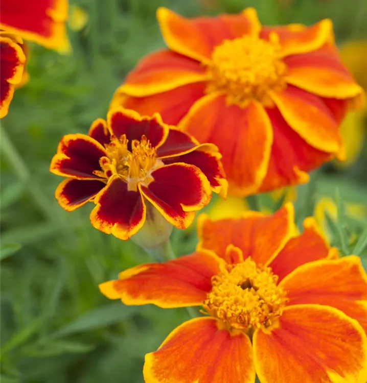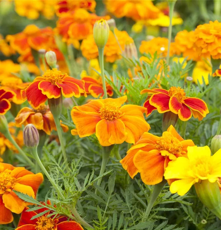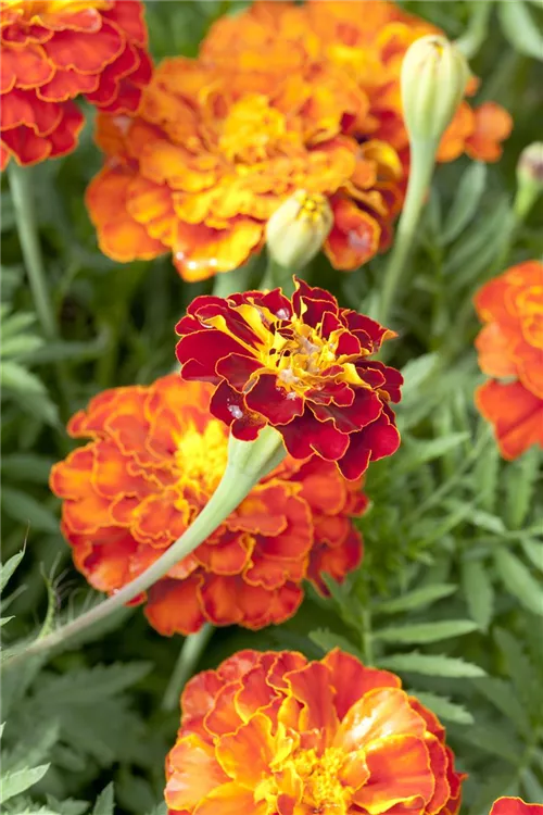 Je nach Sorte, bildet Tagetes patula Blüten in verschiedenen Farben. Diese sind leicht duftend und werden etwa 5 cm groß.