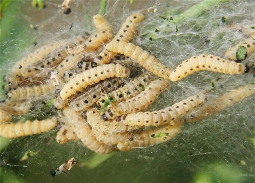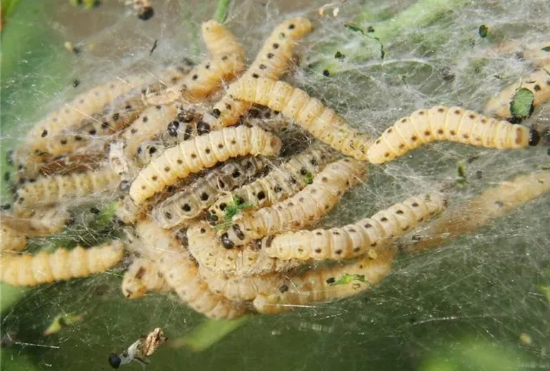Im Mai und Juni bilden hellgraue oder cremefarbene Larven auffällige Gespinste zwischen kahlgefressenen Zweigen.