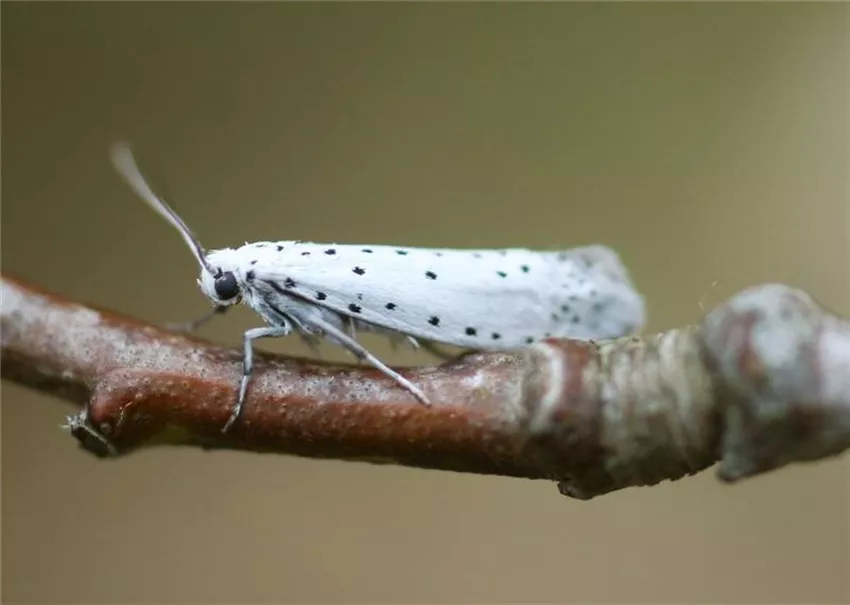 Die Gespinstmotte an Pfaffenhütchen (Yponomeuta cagnagella) ist ein kleiner helle Falter von ca. einem Zentimeter Länge. Die weißen Flügel sind auffällig schwarz gepunktet.