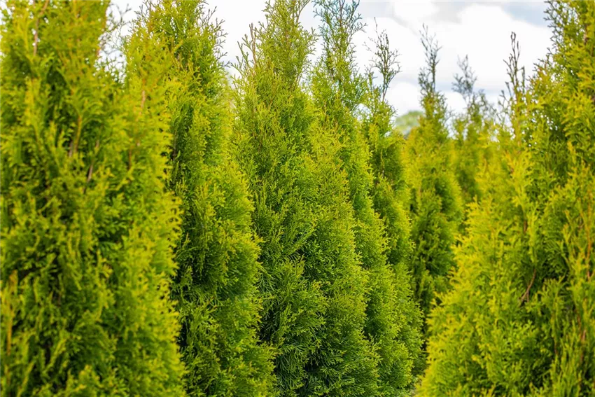 Wer eine Thuja im Garten pflanzen möchte, der hat definitiv eine richtige Entscheidung getroffen. Denn auch, wenn die Pflanzen oft mit den Waschbetonplatten aus den 70er gleichgesetzt werden: Sie haben so viel zu bieten! Vor allem ihre Pflegeleichtigkeit ist es, die sie so beliebt macht. Wo viele andere Pflanzen lieber zum Sonnenschirm greifen würden, freuen sich Lebensbäume über einen vollsonnigen Standort, kommen aber auch mit Halbschatten zurecht. Den einzigen Anspruch, den sie haben: Einen gleichmäßig feuchten Boden, der auch im Sommer nicht austrocknet. Wer für ein optimales Wachstum und eine prächtige Entwicklung der Thuja sorgen will, der setzt sie in einen humosen, sandigen und kalkhaltigen Boden, der nicht zu Staunässe neigt. Und was den pH-Wert angeht: Da zeigt der Lebensbaum erneut, wie wenig Ansprüche er stellt. Denn egal, ob sauer oder alkalisch – der Lebensbaum kann sich mit ausreichender Humusversorgung und der passenden Bodenfeuchte an jeden Wert anpassen und wird sich dort genauso gut entwickeln, wie an einem anderen Ort. Kein Wunder also, dass Thujen besonders als Heckenpflanzen so beliebt sind. Sie machen wenig Arbeit, passen sich an und ergeben im Handumdrehen eine blickdichte und immergrüne Hecke, die keine neugierigen Blicke der Nachbarn zulässt.
