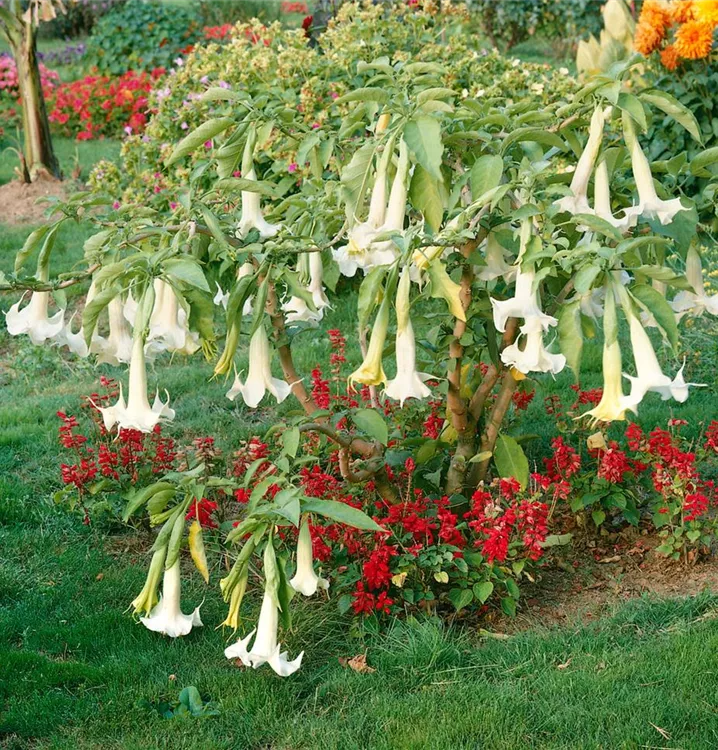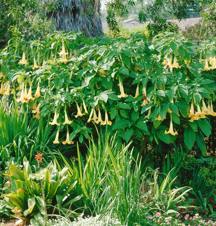 Brugmansia bildet während der gesamten Saison zahlreiche glockenförmige, zweifarbige Blüten. Diese verströmen einen angenehmen Duft.