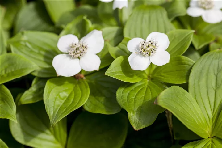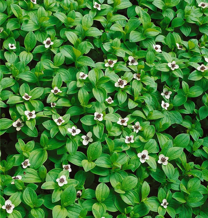 Der Teppich-Hartriegel (Cornus canadensis) ist ein teppichartiger Halbstrauch mit dekorativen, roten, runden Früchten. Die Blüten erscheinen je nach Sorte in verschiedenen Farben.