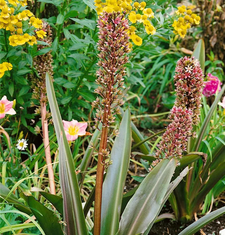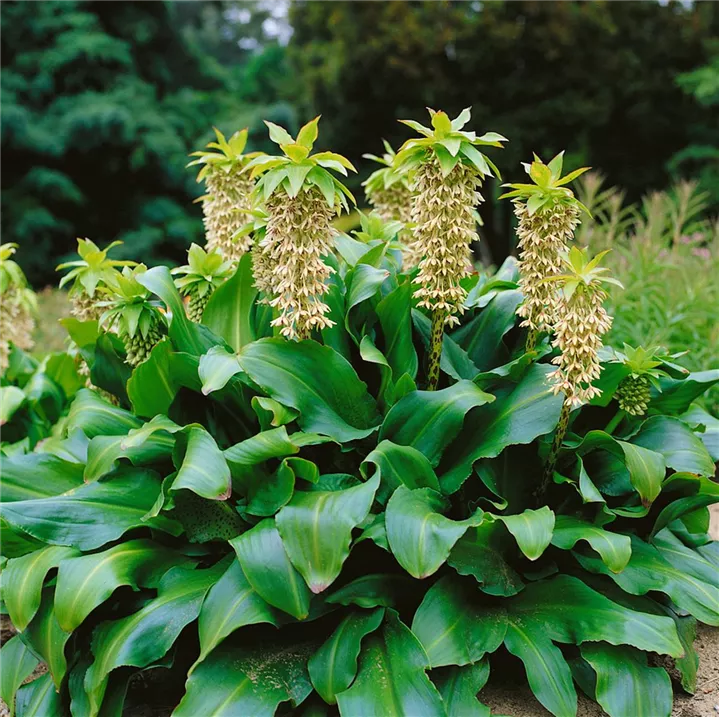 Die Schopflilie (Eucomis comosa) bringt ansehnliche, grün-weiße, leicht duftende Blüten von Juli bis September hervor. Bevorzugt wird ein durchlässiger, humoser Boden in sonniger Lage. Die aufrechte Staude erreicht gewöhnlich eine Höhe von 0,6 - 1 m und wird bis zu 50 cm breit.