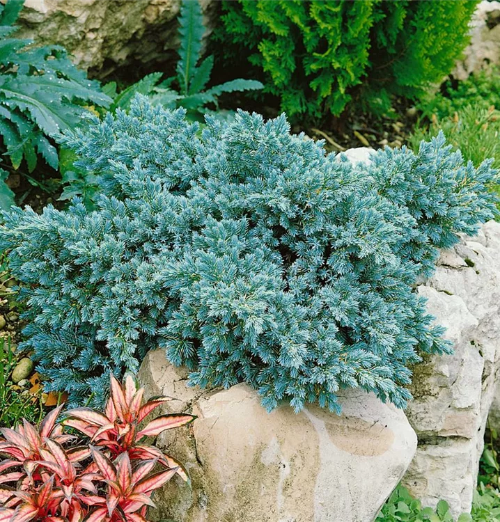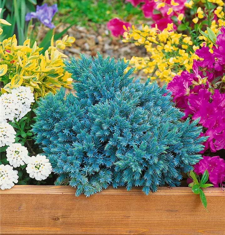 Der Blaue Zwerg-Wacholder 'Blue Star' (Juniperus squamata) ist ein Kleinstrauch, welcher breit, kriechend, polsterbildend wächst und gewöhnlich eine Höhe von ca. 1 m und eine Breite von ca. 1,5 m erreicht. Seine schuppenförmigen Blätter haben eine silberblaue Färbung. Dekorative blaue Zapfen zieren Juniperus squamata 'Blue Star' ab August. Dieses Gehölz ist gut frostverträglich. Er bevorzugt durchlässigen, nährstoffreichen Boden in sonniger bis halbschattiger windgeschützter Lage.
