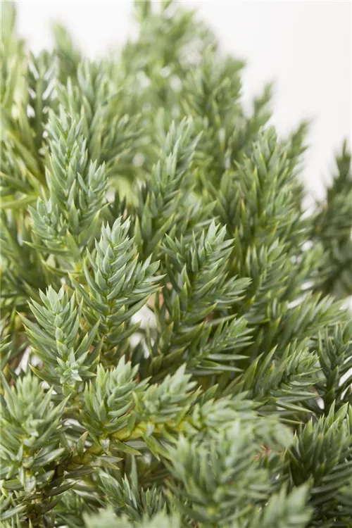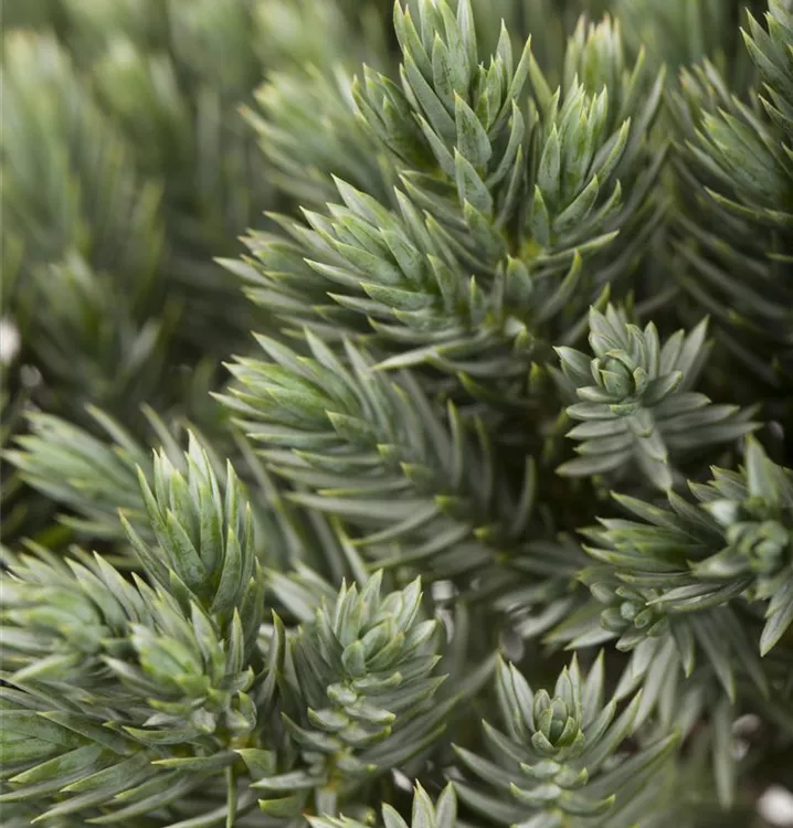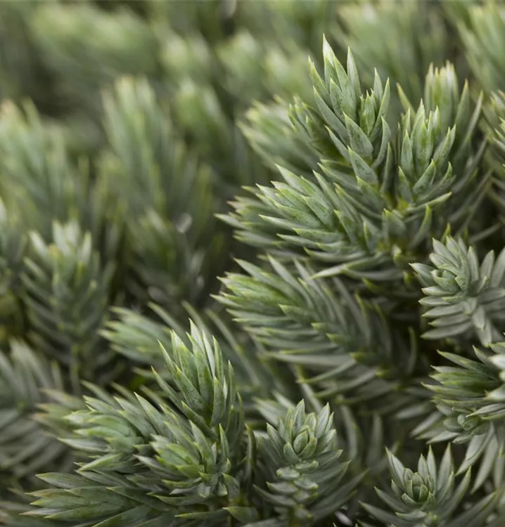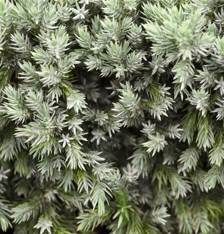 Der Blaue Zwerg-Wacholder 'Blue Star' ist immergrün. Seine Nadeln sind silberblau, stechend, schuppenförmig.