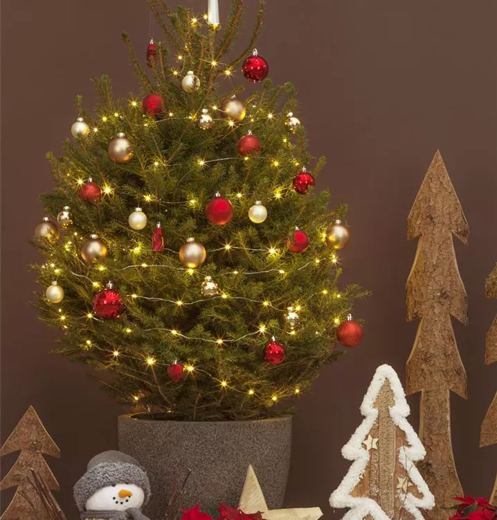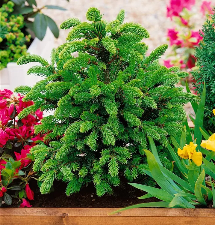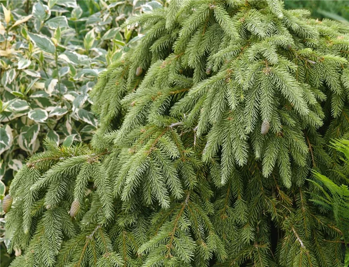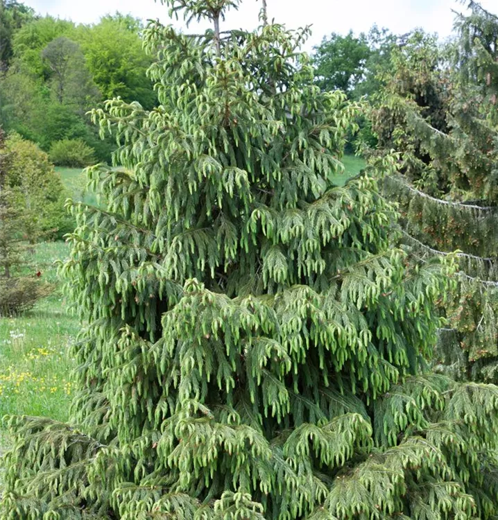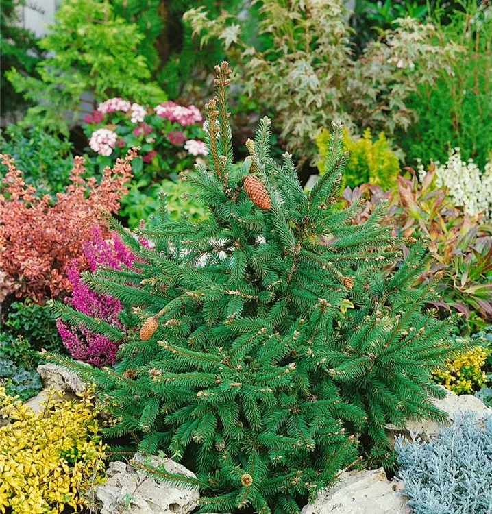 Die Rotfichte (Picea abies) ist ein Großbaum, welcher kegelförmig wächst und gewöhnlich eine Höhe von ca. 50 m und eine Breite von ca. 8 m erreicht. Ihre nadelförmigen Blätter haben eine dunkelgrüne Färbung. Dekorative braune Zapfen zieren Picea abies ab September. Dieses Gehölz ist gut frostverträglich. Sie bevorzugt sandigen, lehmigen Boden in sonniger bis halbschattiger Lage.
