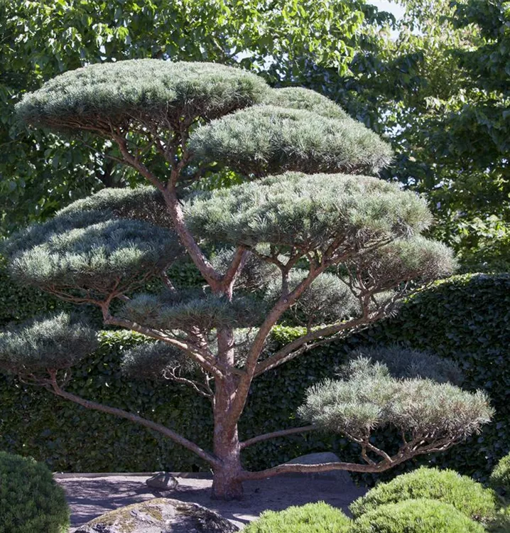 Wald-Kiefer 'Glauca' ist ein kegelförmig und breit wachsender Kleinbaum. Sie erreicht gewöhnlich eine Höhe von 10 - 15 m und wird ca. 5 - 8 m breit. In der Regel wächst sie 20 - 25 cm pro Jahr.