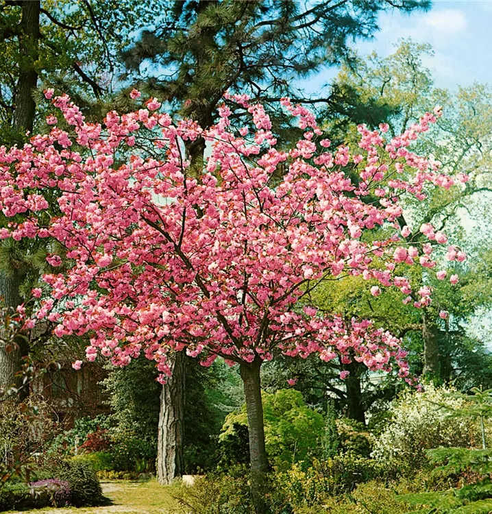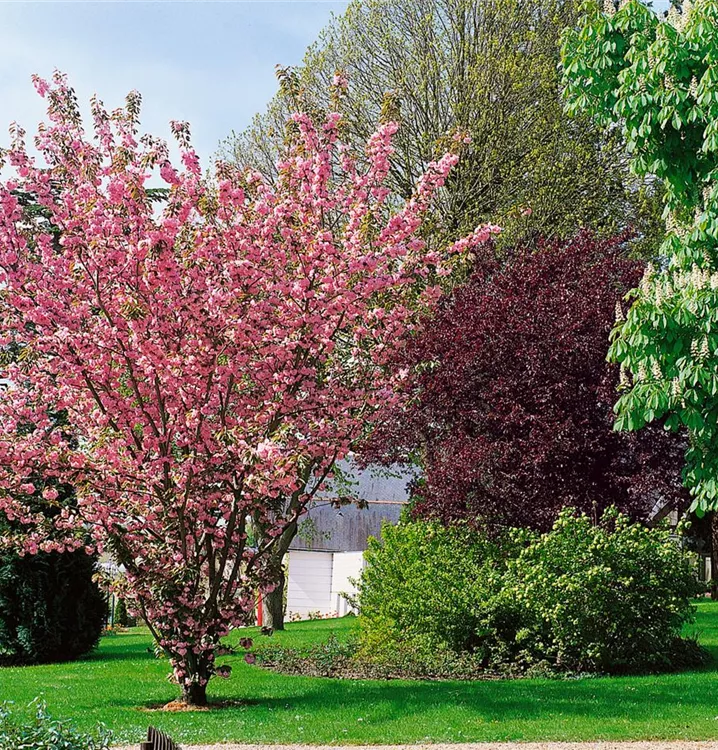 Die Grannen-Kirsche (Prunus serrulata) ist ein Großstrauch mit dekorativen, schwarzen, ovalen, runden Früchten. Die Blüten erscheinen je nach Sorte in verschiedenen Farben.