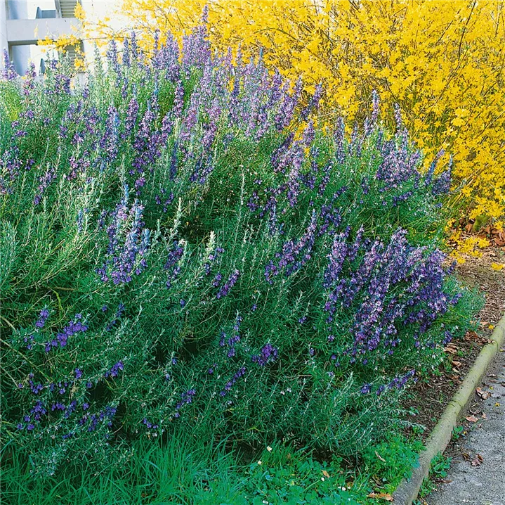 Der Rosmarin 'Blue Winter' (Rosmarinus officinalis) ist eine angenehm duftende Kräuterpflanze mit einem aromatischen, würzigen Geschmack. Seine grau-grünen Blätter sind lanzettlich. Für das optimale Wachstum des Rosmarins 'Blue Winter' werden ein sonniger Standort und durchlässiger, nährstoffreicher Boden benötigt.